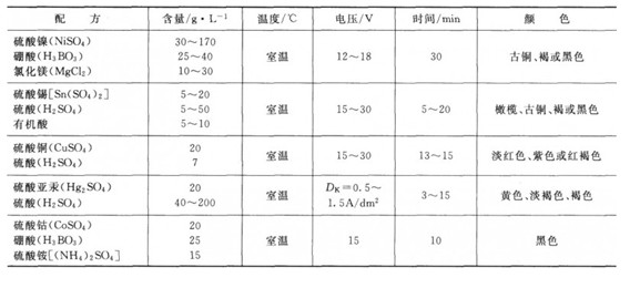 鋁及鋁合金經過陽極氧化后,再放人含有鎳鹽、鉆鹽、錫鹽或銅鹽等溶液中進行交流電解,使膜孔底部沉積上金屬鎳、鈷、錫或銅等而呈現出不同的色彩。該工藝具有工藝簡單、能耗低、著色均勻、生產效率高等特點。表7—4列舉了鋁及鋁合金的電解著色工藝。
