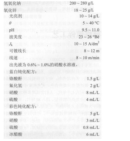 目前,鐵絲、鋼帶的鍍鋅仍較多采用硫酸鋅──硼酸型工藝。此工藝存在不少缺點,如:所用組合光亮劑對人體皮膚有較強的刺激作用,時常引起操作工皮膚過敏;電鍍過程中會產(chǎn)生大量膠狀油泥或沉淀于槽底,有時又漂浮于液面而粘附于鐵絲、鋼帶上,從而影響鍍鋅質(zhì)量;因走速較快會使鍍液中的表面活性劑產(chǎn)生大量泡沫覆蓋于液面,影響工作環(huán)境,時常產(chǎn)生析氫的爆鳴;清洗廢水中含脂肪醇聚氧乙烯醚和苯亞甲基丙酮,其COD值很難達到排放標準的要求。而堿性鍍鋅光亮劑為水基型,不含高分子表面活性劑,廢水處理簡便。