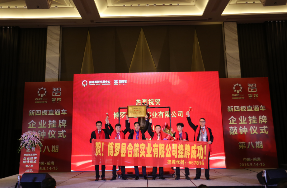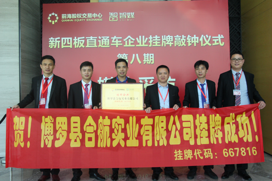 2016年5月15日,博羅縣合航實業(yè)有限公司在莊嚴(yán)的授牌敲鐘儀式中,正式進(jìn)軍“新四板”,企業(yè)掛牌代碼:667816