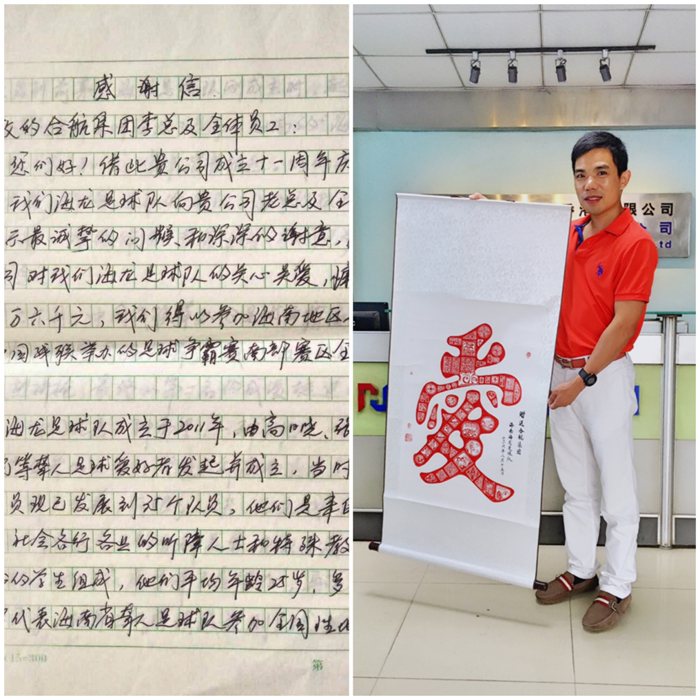 合航集團(tuán)愛心基金會(huì)自成立以來,一直秉持著關(guān)愛員工回饋社會(huì)的理念,為幫助這群可愛的孩子筑夢,合航集團(tuán)于2015年十周年慶典上向海南省海龍足球隊(duì)捐贈(zèng)人民幣五萬元整,并于2016年開始正式撥款資助球隊(duì)比賽。海龍足球隊(duì)為感謝合航集團(tuán)的關(guān)愛,特意為我司李董寄來了親筆感謝信及紀(jì)念品,讓愛散播在每個(gè)角落是我們共同努力的目標(biāo)。